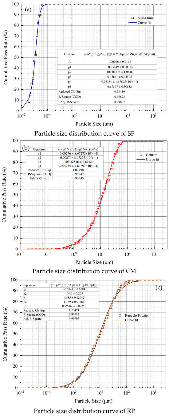 Firstly, based on the tested particle size distribution of each solid component, the appropriate curve function was selected as the particle size distribution curve by the fitting generation function of OriginPro 2021. The results are shown in Figure 5.