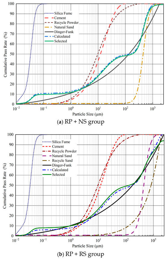 The Dinger–Funk model [15] is based on the maximum packing theory to optimize particle gradation, and it was modified from the Andreasen model [16] to satisfy the fact that the minimum particle size in concrete is always limited. This model has been widely used in the mix proportion design of various concretes [17,18,19].