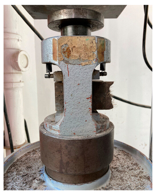 The half prisms obtained after the flexural test were used for compressive strength tests, so the compressive strength is the average value of the six half prisms. The test device for compressive strength is shown in Figure 8. According to GB/T 17671 (1999), the loading rate of the compressive strength test is 2400 N/s ± 200 N/s.
