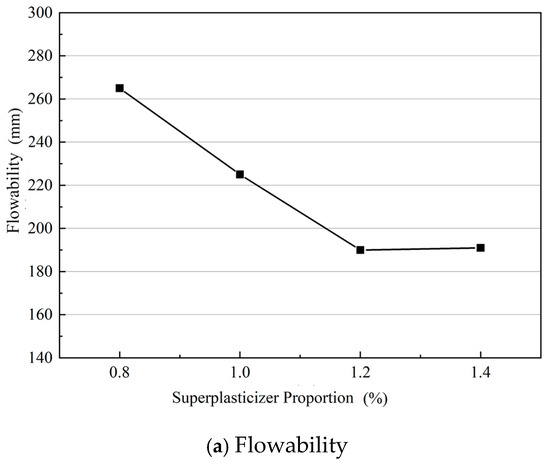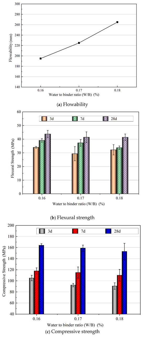 According to Figure 10a, the flowability of GUHPC increased with increases in the water–binder ratio. When the water–binder ratio was 0.16, 0.17 and 0.18, the flowability was higher than 180 mm, which indicates good flowability [20], and no serious segregation was observed. As shown in Figure 10b,c, the flexural and compressive strength decreased with increases in the water–binder ratio.