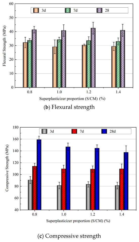 As shown in Figure 9a, when SP/CM increased from 0.8% to 1.2%, the flowability reduced significantly. Excessive superplasticizer can make the cement slurry become viscous, which can cause the flowability to reduce. Figure 9b shows that the amount of superplasticizer has little influence on the flexural strength. As shown in Figure 9c, when the content of superplasticizer was 0.8%, the 3 d, 7 d and 28 d compressive strength of the specimen were all the highest. The dosage of superplasticizer in the GUHPC was selected as SP/CM = 0.8%.