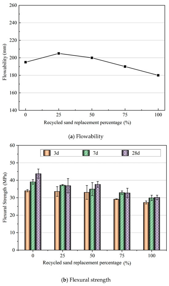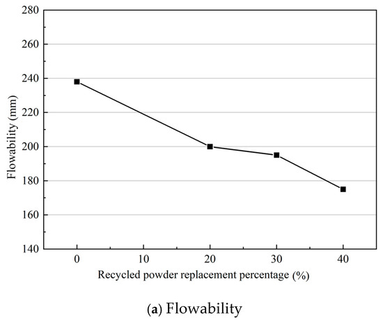 The flowability was tested, as shown in Figure 14a. It can be seen that with increases in the RS replacement amount, the flowability of the GUHPC increased first and then decreased. RS can fill in the gaps between NS, and the flowability of the mix can be improved when the RS content is low at 25%. The water absorption rate of RS was higher than that of NS, and the flowability decreased with increases in the RS content when the RS content was high.