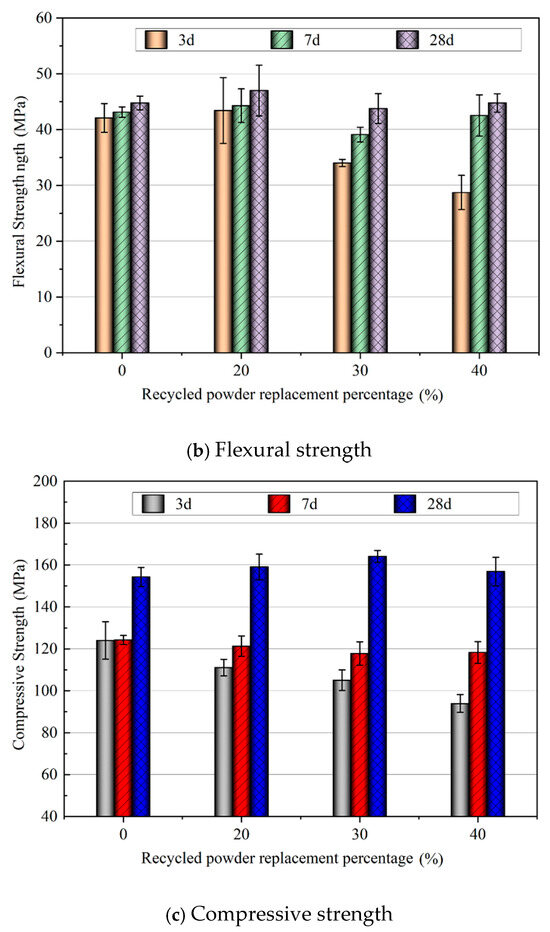 As shown in Figure 11b, with increases in the replacement rate of the RP, the flexural strength increased firstly and then decreased. Compared with the mixture without RP, the 3-day flexural strength for RP replacement rates of 20%, 30% and 40% increased (decreased) by 3.1%, −20.6% and −32.9%, respectively; the 7-day flexural strength by 2.8%, −8.6% and −0.7%, respectively; and the 28-day flexural strength by 4.9%, 2.3% and −0.2%, respectively. Decreases in cement can result in reduced hydration and thus the strength may be lowered. However, the pozzolanic activity of the RP gradually developed over time [4,14], which can increase the strength in later stages.