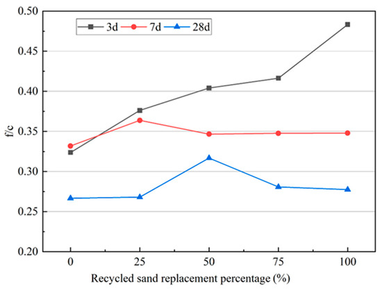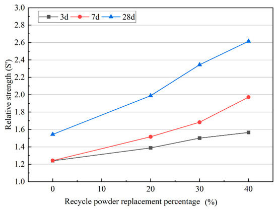 To evaluate the comprehensive effect of RP on strength, the material activity index proposed by Pu [24] was adopted. The relative strength of concrete (S′, MPa) is the contribution of the cement per unit (1% of the cement used) to the strength, as in Equation (2):