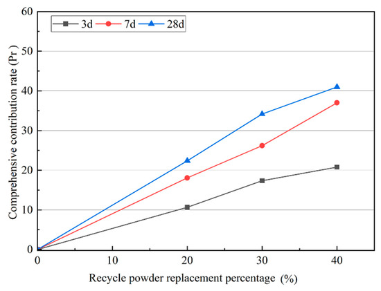 In order to quantify the contribution of RP to the strength of GUHPC, the comprehensive strength contribution rate (Pr,%) proposed by Mao [14] was calculated following Equation (3). When the Pr is greater than 0, it means that the contribution of RP to the strength is greater than that of inert material.