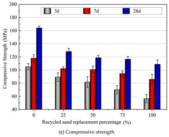 The flexural strength and compressive strength of GUHPC with RS are shown in Figure 14b,c. It can be seen that with increases in the RS content, the flexural strength and compressive strength of the GUHPC was decreased at each age. Compared with mixtures without RS, the 28-day flexural strength for RS replacement rates of 25%, 50%, 75% and 100% decreased by 15.8%, 14.2%, 25.4% and 31.1%, respectively, and the 28-day compressive strength by 21.9%, 27.6%, 29.0% and 33.7%, respectively.