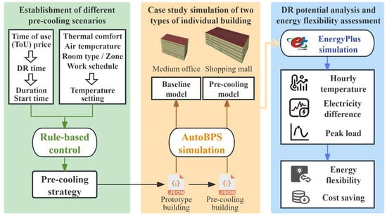 Figure 1 illustrates the overall workflow of the demand flexibility exploration process adopted in this study. The first step was to select a case study building and establish its model in EnergyPlus. The information collection of the selected simulated building had been studied in previous research. So, this study mainly focused on the development of a DR strategy. The simulated case buildings in this study were located in Shenzhen, China, and therefore the real ToU electricity price in Shenzhen was investigated. Based on peak and valley electricity price, the period of time for demand response was set, which determined the duration and start time of the implementation of DR strategies. At the same time, the temperature setting of each strategy was developed according to thermal comfort, outdoor temperature change, zone type, and work schedule, combined with relevant regulations and literature to set the temperature range. By combining the time and temperature settings, several different pre-cooling strategies can be obtained under rule-based control conditions. These pre-cooling strategies applied both pre-cooling and temperature reset. The second step was to simulate the building models by AutoBPS. AutoBPS was an automated building performance simulation tool developed by Hunan University in China []. Two different types of individual buildings were considered in this study: medium office buildings and shopping malls. Through running the JSON files of prototype buildings and buildings with pre-cooling strategies by AutoBPS, the baseline models and varied pre-cooling models under DR strategies were obtained. The third step was to get the results through EnergyPlus simulation and mainly observe hourly indoor air temperature, hourly electricity difference, and peak load reduction. Then, the time over which power can be shifted and the amount of energy or power that can be shifted or shed from these data were calculated. Moreover, the final cost savings of each pre-cooling scenario were calculated through the ToU prices investigated initially. Then, the more effective pre-cooling strategy was compared and summarized. Finally, the optimal pre-cooling control strategy was applied to building clusters, and the DR potential was further explored under the entire group of buildings. This step served as an analysis of the electric power peak-load shifting capability and energy flexibility of pre-cooling implementation.