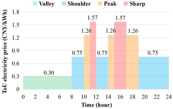 In terms of cost savings, pre-cooling essentially relies on changing electricity prices based on ToU rates, so a more significant change in electricity prices can make the implementation of pre-cooling more effective. And research has found that more electricity costs could be saved as the peak-to-valley electricity tariff difference became wider []. In this paper, buildings in Shenzhen were selected for simulation, and through research, it was found that there was a significant difference in peak and valley electricity prices in Shenzhen. As shown in Figure 2, actual electricity price rules of the region from 1 to 31 July 2024, were used as a reference. Based on the peak-valley time of electricity prices, the DR time can be defined, and the final electricity bills can be figured out.