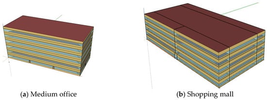 As shown in Figure 3, this paper selected two types of individual buildings as case study buildings for detailed research, namely, medium office building and shopping mall. The main zones of the medium office building and shopping mall were of the same type: office and retail, respectively. According to the Design Standard for Energy Efficiency of Public Buildings (GB 50189-2005, GB 50189-2015) [,] and for Energy Efficiency of Residential Buildings in Hot Summer and Cold Winter Zones (JGJ 134–2001, JGJ 134–2010) [,], as well as referencing the DOE Prototype Building Models, some settings for building envelope and other property parameters had been defined in Table 1, Table 2 and Table 3, which was applicable to all types of prototype buildings. The building data after 2022 were set according to the General Code for Energy Efficiency and Renewable Energy Application in Buildings (GB 55015-2021) [], which applied to both residential and commercial buildings. However, the case study buildings in this research focused on buildings before 2022 and had not yet considered buildings after that. As for temperature change analysis, two rooms on the top floors were selected for each model to study the hourly temperature, as they were greatly affected by the environment. If these rooms can meet the temperature conditions, then the other rooms can also meet the requirements.