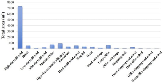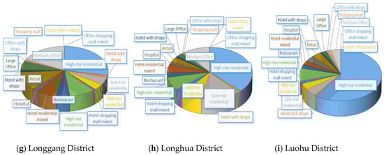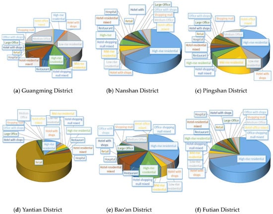 Figure 4 and Figure 5 summarized the amounts and areas of all building types in the building cluster. It can be seen that high-rise residential accounted for the vast majority with the largest amount and area. From the amount distribution of prototype buildings, there were significantly more residential buildings than commercial buildings, with a number of 142,766 buildings, accounting for 64.97% of the total building stock. Moreover, this study also summarized all room types included in the case buildings in Table 5, as well as whether to HVAC control. Among them, the conference room, guest room, and apartment were equipped with independent HVAC systems, which cannot be centrally controlled. Therefore, the implementation of pre-cooling strategies for these rooms relied on people manually adjusting the temperature setpoint independently. In the simulation of the building cluster, this paper conducted a comparative study on the effects of pre-cooling strategies in different administrative districts of Shenzhen and thereby analyzed the DR potential of different regions. The area information of administrative districts was obtained from GIS data. Detailed area data of the research scope selected in different administrative districts are shown in Figure 6, and the proportion of each type of building in the nine administrative districts of Shenzhen is shown in Figure 7.