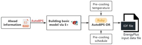 Since AutoBPS already included default settings for basic building information, it was only necessary to input the building type and construction year to generate the building energy consumption model. In previous studies, researchers improved AutoBPS based on the Ruby programming language, developing AutoBPS-DR to generate input data files (IDF) with DR files used in EnergyPlus. Then, the demand-limiting control module in EnergyPlus was used to implement the required DR functions, thereby establishing the DR models automatically. However, EnergyPlus did not come with a pre-cooling module, so it was necessary to control the temperature and schedule of the thermostat to achieve pre-cooling. Based on the work, this study enhanced AutoBPS-DR by adding pre-cooling code to modify the temperature and schedule of the HVAC system thermostat, which can achieve the automated rapid modeling of buildings with pre-cooling strategies. The process of creating EnergyPlus IDF with pre-cooling strategies by AutoBPS-DR (an internal tool module of AutoBPS) is shown in Figure 8.