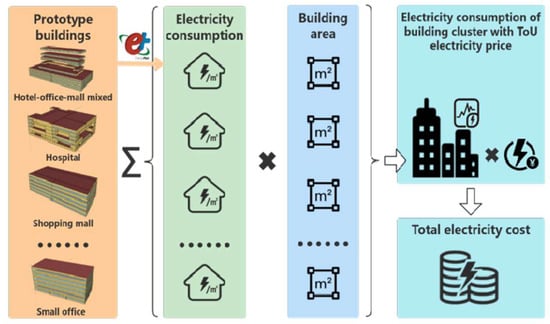 The process of calculating building energy consumption and total electricity cost is shown in Figure 9. Firstly, EnergyPlus was used to simulate the building energy consumption of all prototype models with DR strategies generated by AutoBPS-DR. EnergyPlus [] is a building energy consumption simulation program developed by the U.S. Department of Energy (DOE) and Lawrence Berkeley National Laboratory (LBNL), and it uses the heat balance method as the core of load calculation. This program can dynamically simulate the hourly energy consumption of thermal zones by solving the balance between the indoor loads (from building envelope heat transfer, occupants, equipment, and lighting) and the required heating/cooling capacity for different forms of HVAC systems. Then, based on the performance curves of the chiller, water pump, and cooling tower, the electricity consumption under partial load can be calculated. By combining building area information, the electricity consumption per unit area of each prototype building can be further determined. After that, the GIS information of the building cluster in Shenzhen was used to calculate the total area of each building type. By multiplying the unit electricity consumption with the total area and summing up all values, the overall energy consumption of the building cluster was obtained. Finally, based on ToU electricity price and hourly electricity consumption, the total electricity cost can be worked out.