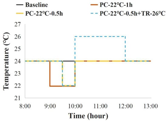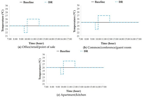 Temperature reset is a common DR strategy for demand shedding to directly reduce the electricity load of HVAC systems by adjusting the temperature setpoint of each thermal zone. This strategy is easy to operate, but sometimes the change in indoor air temperature may break thermal comfort. Therefore, the temperature reset was combined with pre-cooling to cool the indoor air before peak time. This can not only shift the peak load but also delay temperature rise. In most studies related to temperature reset, researchers increased the maximum temperature setpoint by 2 °C according to regulations and standards [,,,,]. Therefore, the strategy used in this study also increased the temperature during DR time by 2 °C, which complies with ASHRAE guidelines.