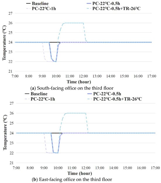 This paper firstly developed three pre-cooling strategies on the two types of individual buildings for detailed research, including only pre-cooling for 0.5 h and 1 h, respectively, and pre-cooling combined with a temperature reset. As stated in Section 2.3, for the adjustment of pre-cooling temperature in some other related studies, it was generally set to decrease by 2 °C. And relevant studies have shown that the cooling temperature setting can be increased by at least 2 °C without significantly affecting the comfort of residents []. From this, the temperature setpoints for pre-cooling and temperature reset of the strategies were defined as shown in Figure 11. Based on the simulation results of individual buildings, the most effective strategy was obtained and implemented in the entire Shenzhen building cluster.