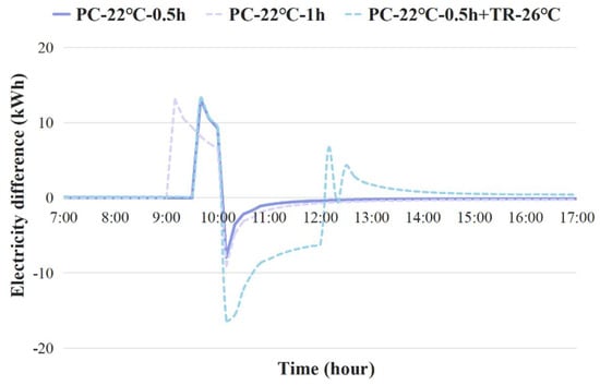 According to the hourly temperature results of the medium office building in Figure 12, there was not much difference in temperature changes between rooms in different locations, indicating that the direction of the rooms had little impact on the effect of pre-cooling strategies for this type of building. Moreover, pre-cooling for only 0.5 h on a medium office building can bring the indoor temperature to the pre-cooling setpoint, and compared with 1 h of pre-cooling, there was no difference in their impact on temperature changes during the subsequent DR period. From the hourly electricity consumption difference with the baseline strategy in Figure 13, it can also be seen that 1 h of pre-cooling did not better reduce the load during the DR period but increased electricity consumption for longer pre-cooling, resulting in unnecessary energy waste.