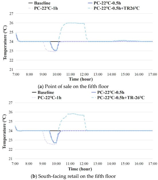 According to the hourly temperature results of the shopping mall in Figure 14, the impact of pre-cooling strategies implementation on indoor temperature varied across different zones. With a temperature setpoint of 22 °C, it can be seen in Figure 14a that the point of sale can only approach 23 °C at the end of pre-cooling, while the south-facing retail in Figure 14b can lower it more but ultimately tends to 22.5 °C and cannot reach 22 °C. It was mainly because the shopping mall had a large building area, and the main indoor loads came from a large number of people, lighting, equipment, and other heat sources. When the temperature setpoint decreased, the HVAC system needed to overcome these continuous heat loads, which made it hard to lower the indoor temperature to pre-cooling temperature. The same as the medium office building, it can be seen from the hourly electricity consumption difference with the baseline in Figure 15 that 1 h of pre-cooling did not have a more significant effect compared to 0.5 h of pre-cooling for the shopping mall but caused energy waste.