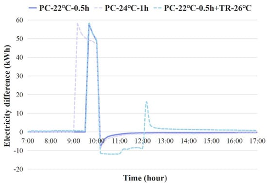 There were more commercial buildings included in the building cluster, which accounted for a larger proportion of the total electricity consumption difference with baseline under the pre-cooling strategy. Moreover, for residential buildings, people usually went out during the day and returned in the evening, while commercial buildings had a large air conditioning load during daytime business hours, so the amount of reduction was also greater.
