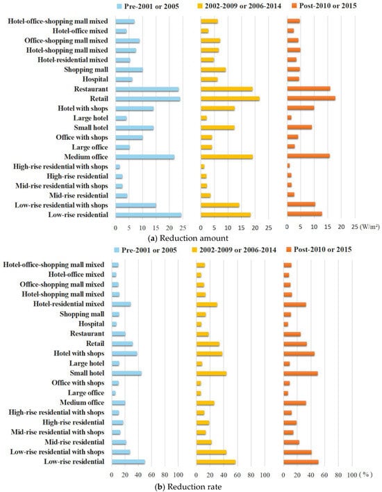 Figure 16 reflects the effects of electricity power reduction during the DR time of each prototype building under the better pre-cooling strategy obtained in Section 3.1.1. Among them, Figure 16a presents the results of average electricity power reduction per unit area; it can be seen that the overall power reduction effect of retail was the best. The reductions for the three construction eras were 23.89 W/m2 of pre-2005, 21.61 W/m2 of 2006–2014 and 17.73 W/m2 of post-2015 respectively. And the results of high-rise residential with shops, high-rise residential, and mid-rise residential with shops are poor, which was because most rooms in residential buildings were equipped with independent air conditioning inside, and residents had poor autonomy in responding to electricity demand. During DR time, they may not adjust the temperature upward, which could affect thermal comfort.