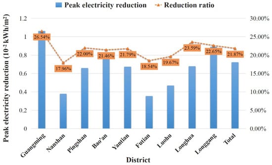 Figure 18 shows the peak electricity reduction of different districts in Shenzhen under the pre-cooling strategy and compared the energy-saving effects of each district by reduction ratio. It can be seen that the pre-cooling strategy had the best implementation effect in Guangming District, which was 26.54% lower than the baseline with a peak electricity reduction of 0.011 kWh/m2. The results in Nanshan District and Futian District were poor, which had relatively low electricity reduction amounts and rates. Figure 18 finally displays the total result for all districts, with an overall reduction of 0.007 kWh/m2 and a reduction rate of 21.87%.