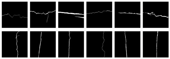 To ensure a sufficient supply of crack segmentation masks for future use, the U-Net model was utilized for automatic segmentation of crack images. Initially, 100 crack images were manually annotated with precision, clearly defining the crack regions to create a high-quality training dataset. These annotated data were then used to train the U-Net model. During the training process, the model’s performance was optimized by adjusting hyperparameters and applying data augmentation techniques, enabling the model to learn and differentiate features between crack and non-crack regions. Upon completion of the training, the U-Net model was employed to generate segmentation masks for 500 crack images, with some of the segmentation results displayed in