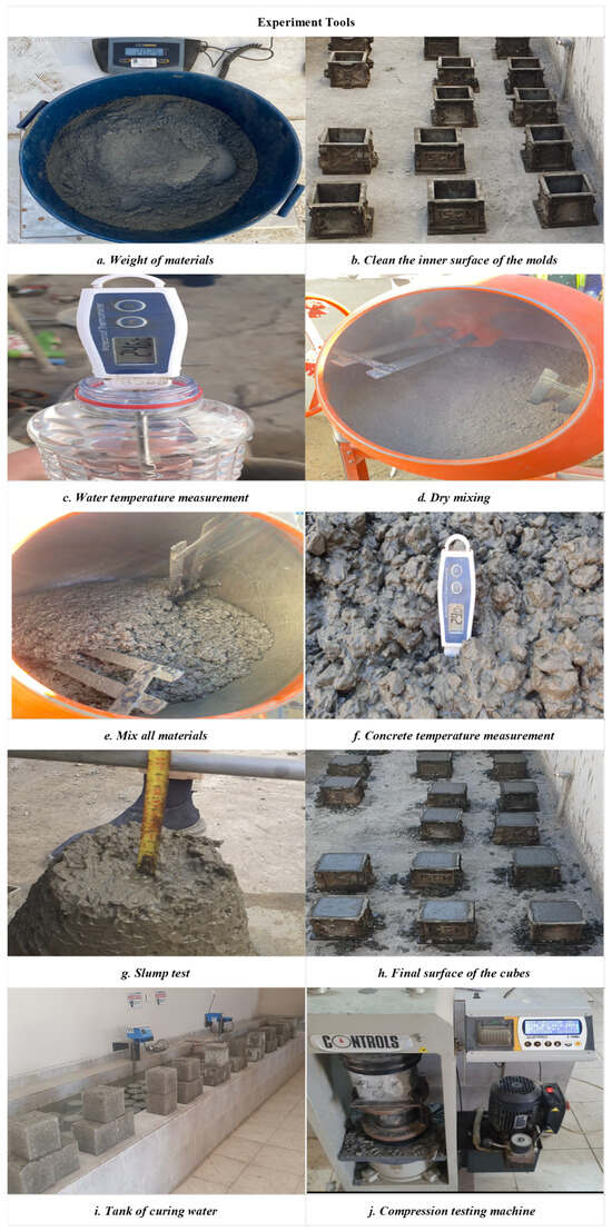 The concrete specimens used in this study were prepared and tested in the laboratory at the University of Tabuk, Faculty of Engineering. The laboratory was equipped with essential testing devices to ensure precise measurements and reliable results. The key equipment utilized in this research included a slump test apparatus to assess the workability of fresh concrete, a compression testing machine for evaluating the compressive strength of cured samples, a digital thermometer for monitoring temperature conditions, an electric cement mixer for thorough mixing of materials, a digital weight scale for accurate measurement of ingredients, and a curing water tank to maintain optimal curing conditions for the concrete samples.