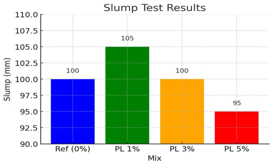 The slump observed for the PL 3% mix returned to 100 mm, identical to that of the reference mix. This result suggests that the positive effect on workability that was observed with 1% PL did not continue as the dosage of the additive increased. At 3% PL, the concrete mixture behaved similarly to the reference mix in terms of workability, indicating that inclusion of the additive at this concentration neither improved nor hindered the slump. It is possible that the effect of PL on the water–cement ratio or the internal friction between particles plateaued at this concentration, resulting in no further changes in the slump value.