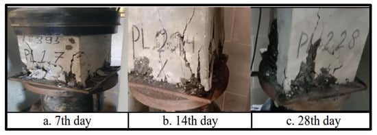Figure 4, the shape of the concrete cube containing 3% PL was analyzed after undergoing compressive strength testing at 7, 14, and 28 days of curing. The results indicated that despite the presence of visible surface cracks, the samples maintained remarkable mechanical performance, suggesting that the inclusion of PP fibers enhanced the structural integrity of the concrete. This improvement is likely to have been due to the uniform distribution of PP within the matrix, contributing to increased compressive strength and crack resistance. On days 7, 14, and 28, the samples demonstrated consistent gains in strength, confirming the positive impact of the PP additive on the material’s long-term performance. PP fibers act as micro-reinforcements, bridging microcracks and delaying their propagation under applied loads. This effect enhances durability and post-crack behavior, reducing brittleness and improving long-term performance. The fibers may also help mitigate shrinkage and thermal stresses, further stabilizing the material.
