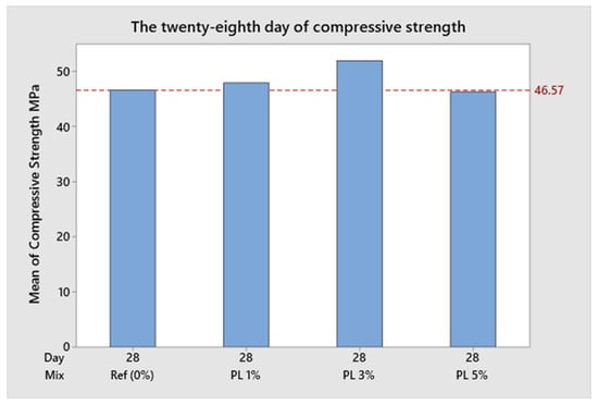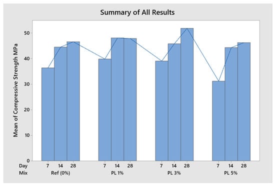 In civil engineering, where concrete is predominantly used in structures subjected to these forces, ensuring optimal compressive strength is vital. The strength of concrete is typically measured in megapascals (MPa), a unit that quantifies the pressure the material can withstand per unit area. The aim of the current research was to examine the development of compressive strength over time and understand how the introduction of the PL additive at different percentages affected this important property. In general, concrete achieves approximately 60–70% of its final strength within the first 7 days, with the remainder of the strength being developed by 28 days. This 28-day strength is often used as the standard for evaluating a specific concrete’s performance.