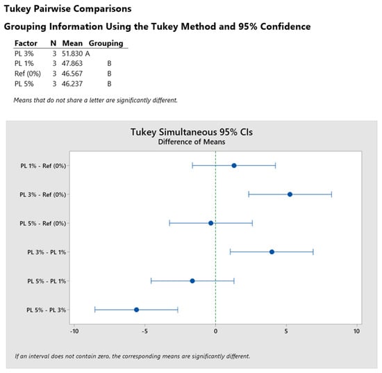 The Tukey pairwise comparison revealed that while the addition of 1% and 5% PL to the concrete mix did not result in a statistically significant change compared with the reference mix, the addition of 3% PL caused a significant alteration in the concrete’s properties. This suggests that the optimal level of PL additive for modifying the concrete’s performance lies around 3%, as this is where the most meaningful changes occurred, as shown in
