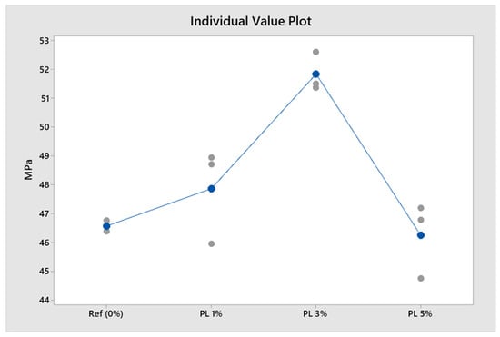 The individual value plot provides a visual representation of the performance of the different concrete mixes containing various percentages of PL additive (0%, 1%, 3%, and 5%) on a particular measured property. Each point represents an individual observation or data point for each mix, and the connected line highlights the trend of changes across the different percentages of PL. From the plot, it is evident that the mix with 3% PL exhibited the highest value, suggesting a peak in performance for this mix. The individual data points for this group are closely clustered around the mean value, indicating low variability within this group and further confirming that the 3% PL mix consistently performed better than the others.
