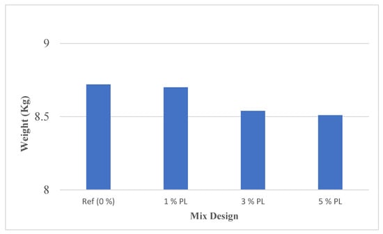 The selection of 1%, 3%, and 5% PP-PL replacement by weight in the concrete was based on an extensive review of previous studies examining the influence of PL waste incorporation on mechanical and durability properties. The decision to use these specific replacement percentages was guided by both theoretical considerations and preliminary experimental trials conducted to assess the feasibility of mixing and casting the concrete with PP-PL. Prior studies have demonstrated that incorporating small amounts of PP-PL into concrete can improve certain properties such as durability and crack resistance, while excessive amounts may significantly reduce compressive strength and workability due to the hydrophobic and flexible nature of the PL particles [