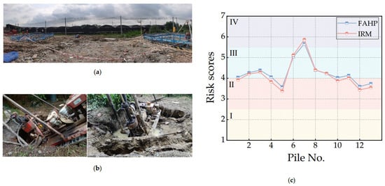 Table 7, this outcome arises because the IRM, in comparison to the FAHP method, assigns slightly larger weights to the higher-ranked factors and smaller weight coefficients to the lower-ranked factors. This may be due to the IRM not adequately taking into account the correlation between the indicators and the systematic nature of the indicators. For pile foundations 1, 4, and 10, the evaluation levels differ between the two methods, with the FAHP method assigning a Level III rating and the IRM assigning a Level II rating. Since all evaluated pile foundations are accident pile foundations, a higher risk evaluation score indicates greater reliability for high-risk pile foundations. Therefore, it can be concluded that the FAHP method provides a more accurate assessment in this case, as the evaluation results are more in line with the actual situation and are thus more reasonable.