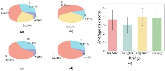 Figure 3. As can be observed from the results, among the four bridges, Class II piles constitute the largest proportion: 40.48% for the Baini River Grand Bridge, 53.33% for the Hengbei Bridge, 60% for the main bridge of the Dayan River Grand Bridge, and 64.44% for the Beijiang Grand Bridge. The proportions of Class I and Class IV piles are relatively smaller. Specifically, Class I piles account for 21.43%, 33.33%, 0%, and 0%, respectively, while Class IV piles account for 6.55%, 0%, 7.32%, and 4.44%, respectively. Notably, besides the Hengbei Bridge, the other three bridges have pile foundations with Class IV construction risks. This is attributed to the relatively stable site conditions and weaker karst development (the linear karst rate is 12.3%) in the bridge area of the Hengbei Bridge. The mean risk scores for four bridges are all in the range of 3–4, and the standard deviation of the scores was around 1.000, The specific values are shown in