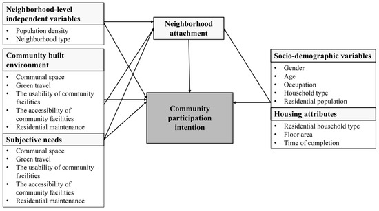Prior research suggests that CPI may be influenced by a range of variables, including socio-demographic background, community environment, and individual subjective perceptions (community attachment and beliefs) [17]. Expectancy confirmation theory affirms that an individual’s expectations and satisfaction can influence behavioral intentions [16]; thus, we included environmental satisfaction ratings. Community public space has a facilitating effect on community and cross-group interactions but may have differential effects due to the diversity of spaces, such as traditional public spaces (parks and streets) and quasi-public spaces (consumer facilities, etc.) [55]. We therefore distinguish between community communal spaces and community facilities. In addition, yard maintenance and garbage disposal were found to be associated with older adults’ participation in community activities [60] and were therefore included in the evaluation dimension of the community environment. Established research has concluded that the built environment and community facilities significantly predict place attachment [48]. Stronger place attachment can promote citizen engagement to improve living conditions. Therefore, this study introduces neighborhood attachment into the model to verify the effect on CPI. Individuals’ subjective characteristics (e.g., functional dependence on local resources and community facilities, and the need for creating space) can reflect people’s attitudes and behavioral intentions toward place [75]. In addition, we controlled for individual socioeconomic attributes and living conditions to ensure the accuracy of the findings.