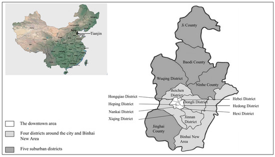 Population density directly affects resource allocation in communities and the availability of open spaces, affecting residents’ quality of life, urban vitality, and social cohesion [67]. We used data from statistical yearbooks to classify the administrative divisions of Tianjin into three categories according to population density: the central urban area, the four surrounding districts and the Binhai New Area, and the five outer suburban districts.