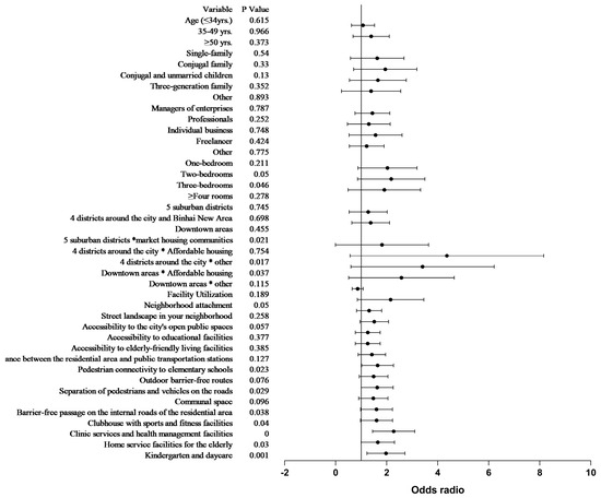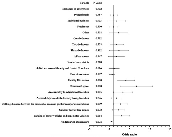 The parameter estimates of the regression model identified several factors influencing CPI, including family type, community attributes, usability of facilities, neighborhood attachment, and residents’ requirements (Table 5a). Residents’ requirements are categorical variables that were transformed during regression. Data analysis revealed that many of the residents’ needs for the community environment were significant influences on CPI, including safety for green travel, open spaces, and the usability of community facilities. The expression of these demands significantly increased the likelihood of residents’ CPI, with the demand for sanitation services and health management facilities in the neighborhood having the greatest impact, increasing CPI by 2.174 times (p = 0.000).