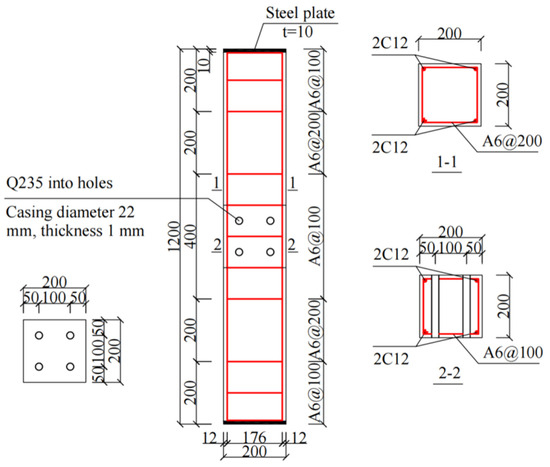 An experimental investigation of bolted beam–column joints (specimens depicted in Figure 1) was conducted in the study by Ma et al. [30], wherein the cross-sectional dimensions of the precast columns were 750 mm × 750 mm. The existing literature suggests that the scaling of specimens does not significantly influence the accuracy of the outcomes [38]. Therefore, two groups of six scaled precast concrete column specimens with varying opening ratios were utilized for experimental investigations, as detailed in Table 1. The cross-sectional dimensions of the specimen columns were 200 mm × 200 mm, with a height of 1200 mm. The design parameters and reinforcement specifications are presented in Table 2 and Figure 2.