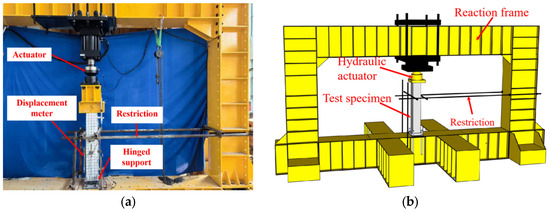 The on-site test setup and its schematic diagram are presented in Figure 3. To accurately simulate the real-world structural conditions, a hinged support system was implemented at the base of the concrete column. This support system, measuring 250 mm × 250 mm in cross-section, was engineered with a substantial load-bearing capacity of 1200 kN to accommodate the anticipated structural loads. The support was specifically designed to allow the rebound point to occur at the mid-height of the concrete column during the testing procedure. To ensure the experimental precision and specimen’s stability, the hinged support was securely anchored to the testing apparatus by four high-strength bolts, guaranteeing the exact positioning and alignment of the test specimen. To prevent the sudden collapse of the precast column at the end of the test, safety measures, including protective barriers, were implemented around the specimen.