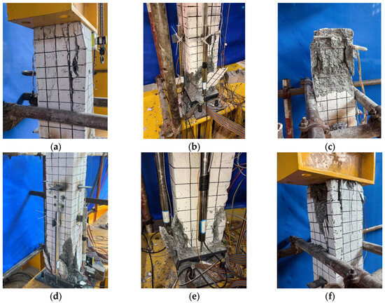 Damage patterns of specimens: (a) ZY14-1; (b) ZY14-2; (c) ZY14-3; (d) ZY22-1; (e) ZY22-2; (f) ZY22-3.