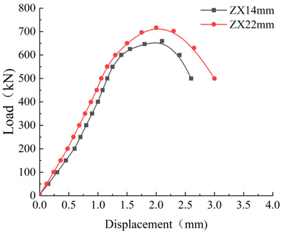 Figure 6 illustrates the load–displacement curves derived from the average of two sets of test data. The curves for both sets of axially compressed specimens can be divided into elastic and elastoplastic phases. During the elastic phase, the curve behavior is primarily influenced by the elastic modulus of the material. Both the ZY14 and ZY22 specimens exhibited a cracking load of 300 kN. At this load, the ZY14 specimen experienced a displacement of 0.63 mm, while the ZY22 specimen was displaced by 0.61 mm, representing a 3.2% reduction in displacement compared to the ZY14 specimen. As the displacement increased, the bearing capacity of the ZY22 specimen rose slightly faster than that of the ZY14 specimen.