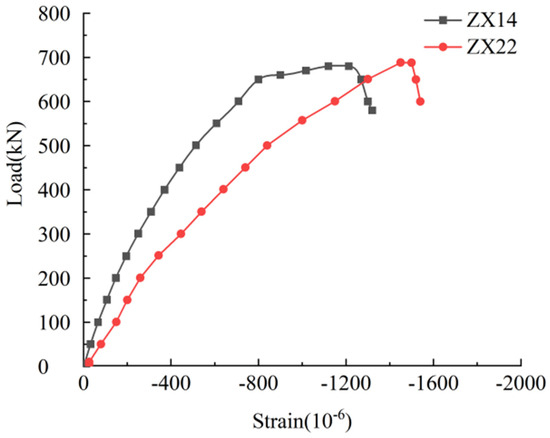 Figure 7 presents the load–strain curves at position 1Z for both the ZY14 and ZY22 specimens, highlighting distinct mechanical behaviors between the two groups. At the cracking point, the ZY14 specimen exhibited a strain of −250.6 με, while the ZY22 specimen showed a significantly higher strain of −445.8 με, representing a 78% increase in reinforcement strain for the latter. A similar trend is reflected in the maximum load, where the reinforcement strains reached −1269.5 με for ZY14 and −1428.4 με for ZY22, indicating a 12.5% higher strain in the ZY22 specimen. The observed differences in strain behavior can be attributed to the greater cross-sectional weakening in the core area of the ZY22 specimen, which results in elevated cross-sectional stress concentrations and consequently leads to increased reinforcement strain development throughout the loading process.