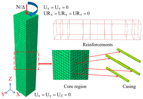 The load transfer mechanism was analyzed using an ABAQUS finite element analysis (FEA). Figure 8 illustrates the FEA model of the precast column. An eight-node solid element with reduced integration (C3D8R) was employed to simulate the non-linear behavior of the concrete column, while a two-node truss element (T3D2) was used to model the reinforcement. The casing was affixed to the concrete surface using a tie-binding connection, which established the interaction relationship through the ‘surface-to-surface’ contact method. Considering the stress distribution of the specimen, the mesh was coarsely subdivided. The mesh sizes were set to 20 mm for the precast column, 25 mm for the reinforcement, and 5 mm for the casing.