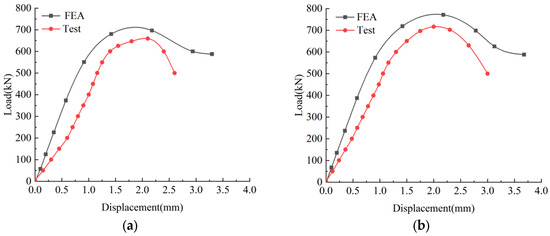 Figure 9 compares the load–displacement curves obtained from the experimental results and finite element predictions. For specimen ZY14, the peak load from the experimental results is 8% lower than that of the analytical model, with a 5% difference in the corresponding axial displacement at peak load, as plotted in Figure 9a. Similarly, for specimen ZY22, the experimental peak load is 7% lower than the analytical model, with a 10% difference in the corresponding axial displacement, as depicted in Figure 9b. Discrepancies between the experimental and simulation results may arise from variations in the uniformity of the concrete distribution among specimens or differences in reinforcement positioning during construction. Additionally, the curve from finite element analysis exhibits a relatively flat descending segment, while the experimental curves show a steeper load drop during this phase. This difference is likely due to stress concentration during testing, leading to localized damage. The simulated specimens assume idealized boundary conditions, load application, and material distribution, which are difficult to replicate in actual construction. As a result, the overall performance of the experimental specimens was slightly lower than the simulation results but remained consistent with real-world conditions.