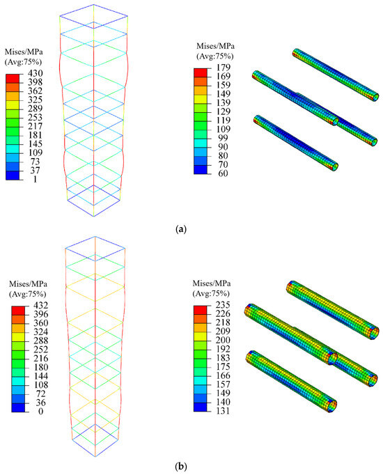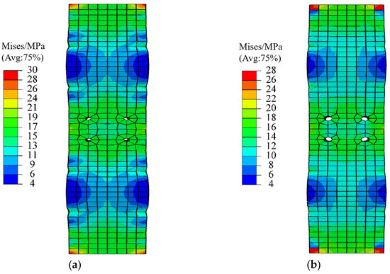 Figure 10 illustrates the strain distribution of the specimens during the failure phase. At failure, the non-encrypted concrete area exhibits more significant deformation. Additionally, the strain values in the core area of the opening increase with the size of the opening. Figure 11 depicts the stress distribution in the reinforcement and casing during specimen failure. At failure, the casing in the core area of specimen ZY22 experienced higher stress levels due to the smaller concrete cross-section. Consequently, both the reinforcement and casing in specimen ZY22 were subjected to greater stress compared to specimen ZY14.