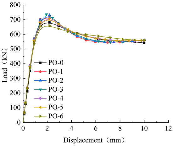 Figure 12 illustrates the load–displacement curves of specimens with different opening ratios. Within the elastic stage (0–1 mm displacement), the growth trends of the curves are nearly identical. Upon entering the elastoplastic stage, the load–displacement curves of the six specimen groups exhibit varying degrees of change. The peak load of the specimens varies with the opening ratio. The PO-3 specimen achieves a load capacity of 739 kN, while the load capacities of the other specimens (PO-0 to PO-2 and PO-4 to PO-6) decrease by 9.3%, 3.7%, 0.6%, 3.1%, 5.1%, and 10.8%, respectively, compared to PO-3. The data indicate that when the opening ratio is between 14% and 30%, the overall compressive load capacity of the specimens remains relatively stable. However, when the opening ratio reaches 34%, a significant reduction in load capacity can be observed. At an opening ratio of 22%, the strengthening effect of the casing in the core area is offset by the weakening effect of the opening ratio. Beyond this point, the strengthening effect of the casing diminishes, the weakening effect of the opening ratio becomes more pronounced, and the axial compressive load capacity decreases significantly at an opening ratio of 30%.