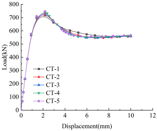 Figure 13 illustrates the load–displacement curves of specimens with varying casing thicknesses. For specimens CT-1 to CT-5, under a constant opening ratio, the load–displacement curves exhibited similar growth rates during the elastic stage, showing no sensitivity to changes in casing thickness. However, upon entering the elastoplastic stage, the curves diverged significantly. Specimen CT-1 achieved a peak load of 718.3 kN, while specimens CT-2 to CT-5 demonstrated progressive increases in peak load by 1.9%, 3.1%, 3.8%, and 3.77%, respectively, compared to CT-1. The experimental results confirmed a proportional relationship between the casing thickness and ultimate load capacity. However, when the casing thickness exceeded 2 mm (CT-4) and 2.5 mm (CT-5), the improvements in load-bearing capacity became statistically insignificant, with incremental gains of less than 0.5%.