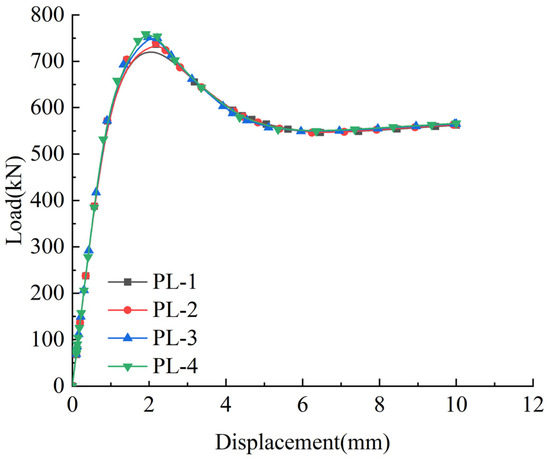 Figure 14 illustrates the load–displacement curves of specimens with varying bolt preloads. The load–displacement curves of specimens PL-1 to PL-4 exhibit similar trends during both the elastic and elastoplastic stages. Specimen PL-1 achieves a peak load of 736.9 kN, while specimens PL-2 to PL-4 demonstrate gradual increases in peak load capacity by 0.46%, 1.74%, and 2.96%, respectively, compared to PL-1. Although the load–displacement curves of the four specimens are nearly identical in shape, the peak load shows a gradual increase with higher bolt preloads.