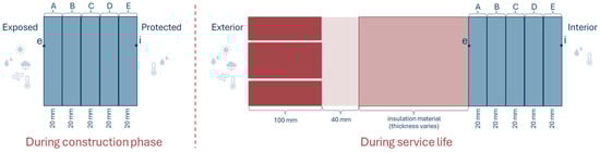 In each of these simulations, the time of wetness TOW25/10 (the number of hours where a moisture content higher than 25% occurs during a period with a temperature higher than 10 °C) is calculated to get an idea of the possible degradation in different locations within the CLT panel. The TOW25/10 is calculated in the first millimeter exposed to the outside environment (e); in the first millimeter exposed to the protected environment (i); and for the average temperature and moisture contents in layers A, B, C, D, and E, as shown in Figure 1 (during service life).