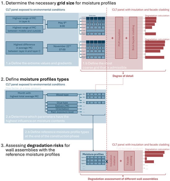 This study investigates the decay risks associated with built-in moisture in CLT wall assemblies during construction (step 3). Differing from previous research, this study focuses on the central regions of CLT wall panels. However, to accurately assess the risk of degradation, it is first necessary to understand how moisture is distributed within the panel (step 2) and whether that distribution significantly impacts decay potential (step 1).
