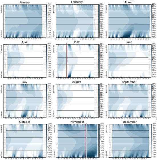- Rain Exposure: The rain exposure level had the strongest influence on the moisture content in the outermost 5 mm (with a difference of 128.05 %points) and in layer A in general (with a difference of 40.26 %points), underscoring the need for protection against the outdoor climate during the construction period. Only slight differences in moisture content in the other layers become noticeable after about 2 weeks (layer B), 3 weeks (layer C), or even later (layers D and E).